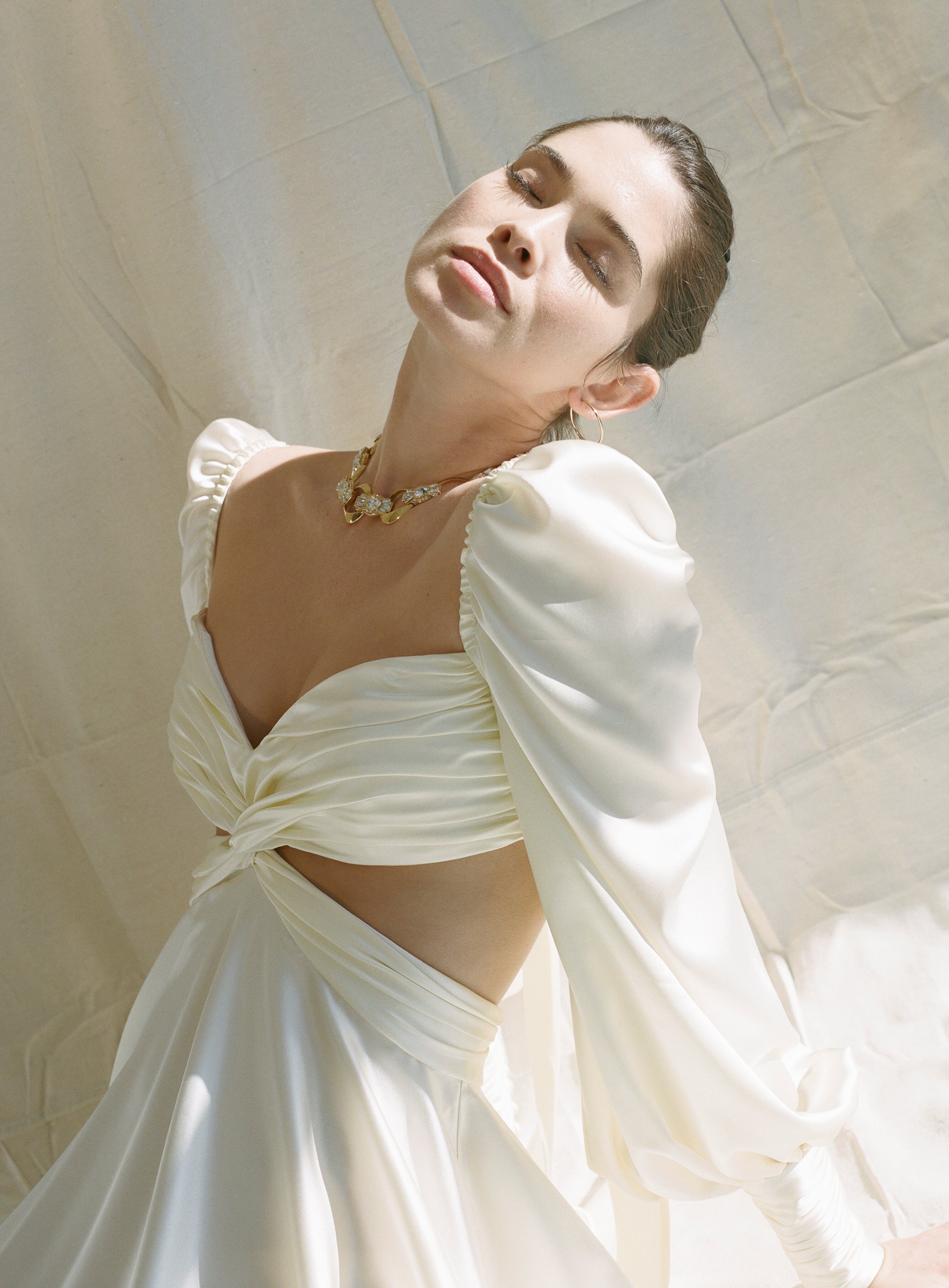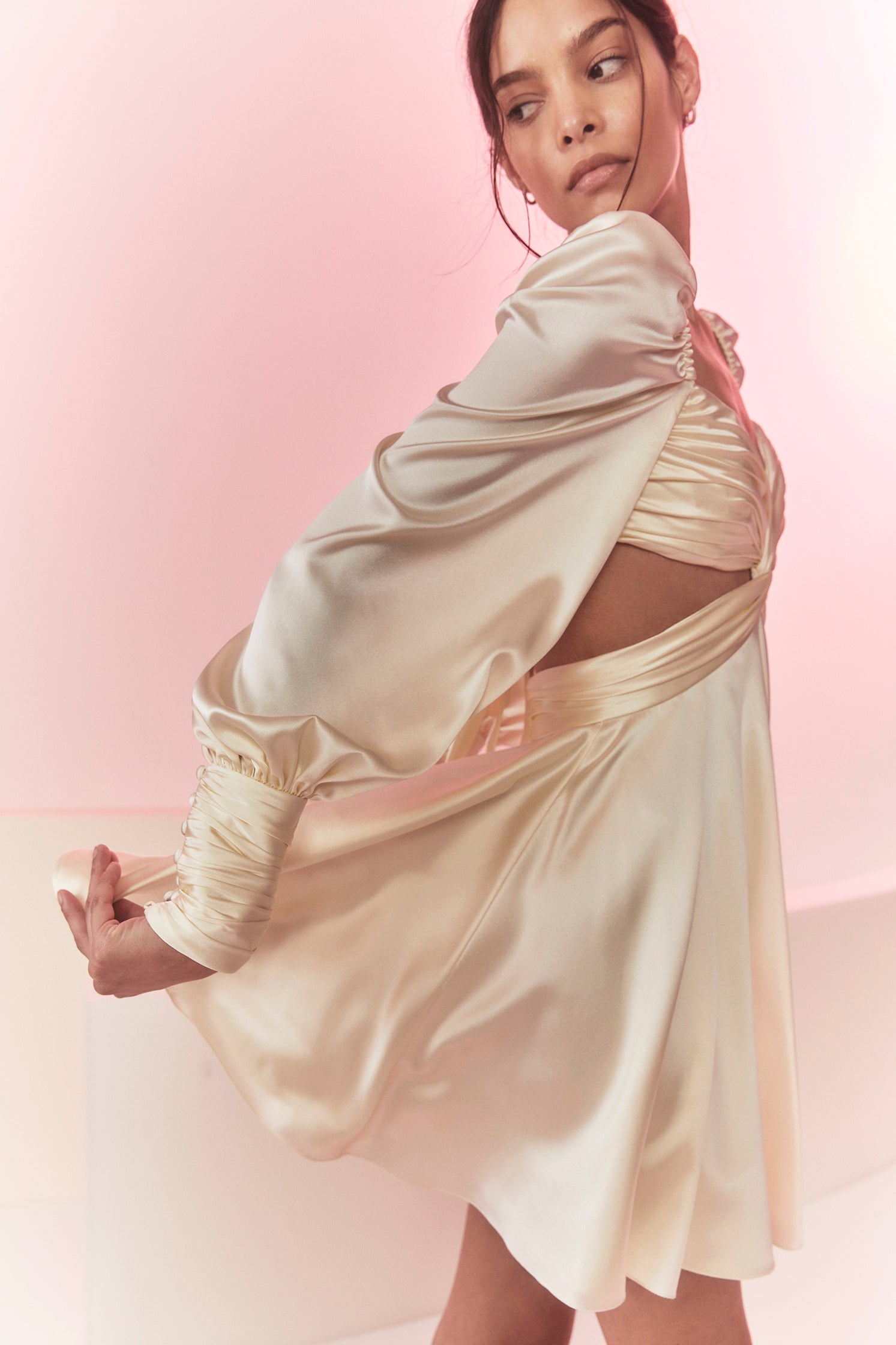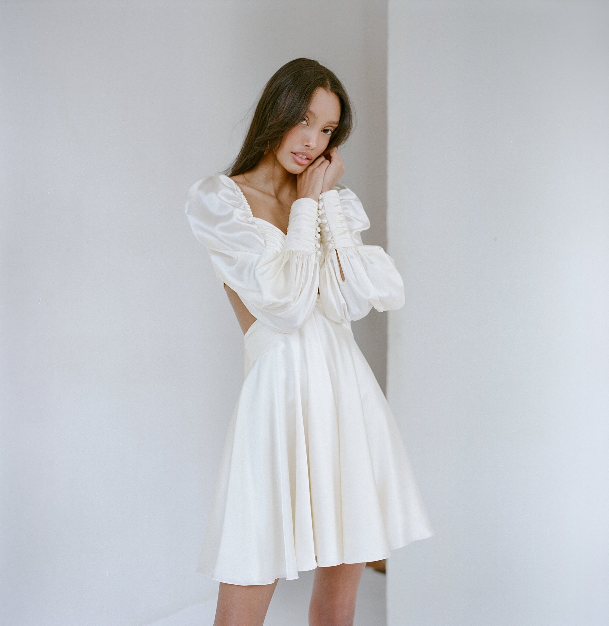 Dress with the most delicate, hand-tacked drapes along the bust, waist, and sleeves. Adjustable, long bow ties in the back along with side cutouts for additional drama.